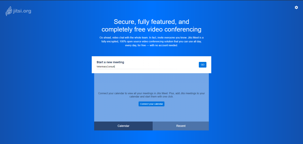 • Give the meeting a name, the example below is called “VeterinaryConsult”. This must be something unique to your meeting i.e. the practice name. Then click GO. It may ask to install a Chome extention if you’re using the google Chrome web browser, this isn’t required.